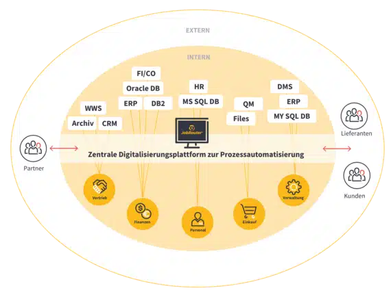 JobRouter® ist eine flexible Digitalisierungsplattform, die es Unternehmen ermöglicht, ihre Geschäftsprozesse zu automatisieren und zu optimieren. Durch die Vernetzung aller Systeme und Fachabteilungen entsteht eine einheitliche und effiziente Arbeitsweise.