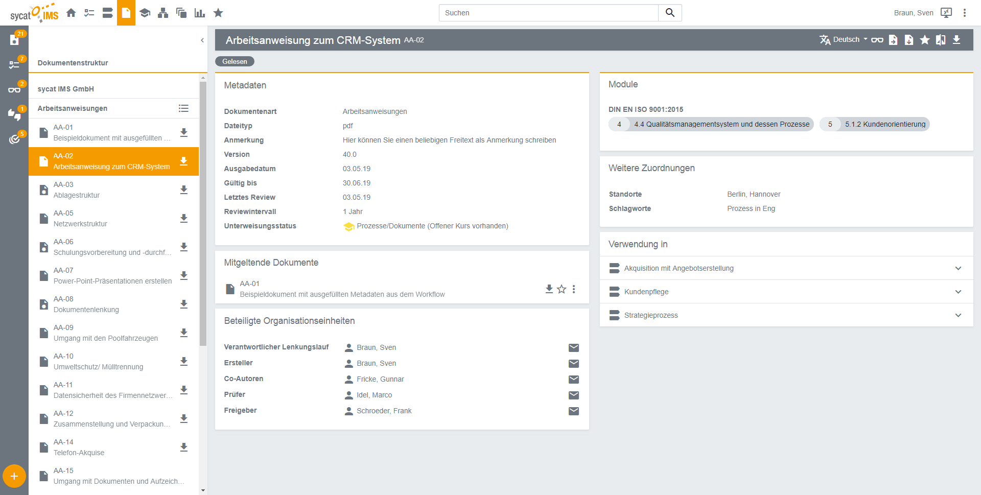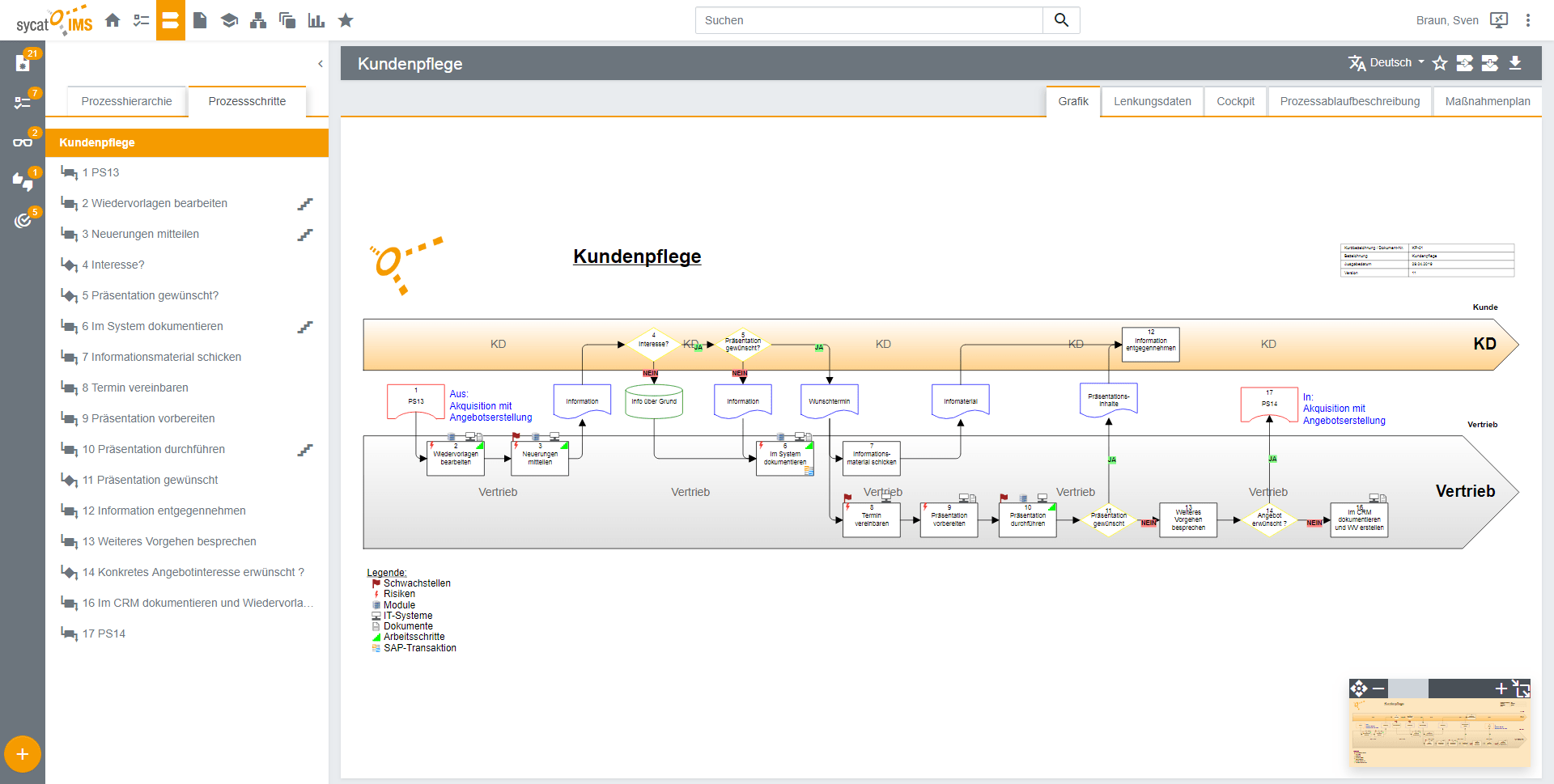 • Verknüpfung der einzelnen Prozessschritte mit sämtlichen zugehörigen Informationen, wie mitgeltende Dokumente, IT-Systeme, AA, VA usw.
