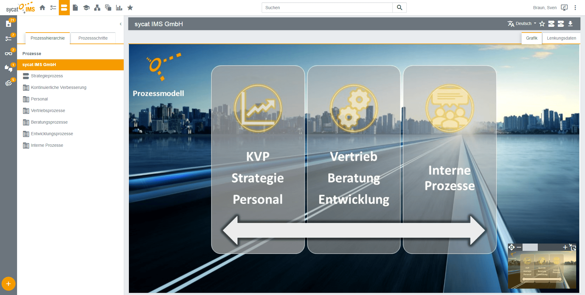 Über interaktive Prozesslandkarten können auch ungeschulte Mitarbeiter intuitiv Aufbau und Abläufe erkennen und interaktiv von den Kern- zu den detailliert beschriebenen Teilprozessen klicken.