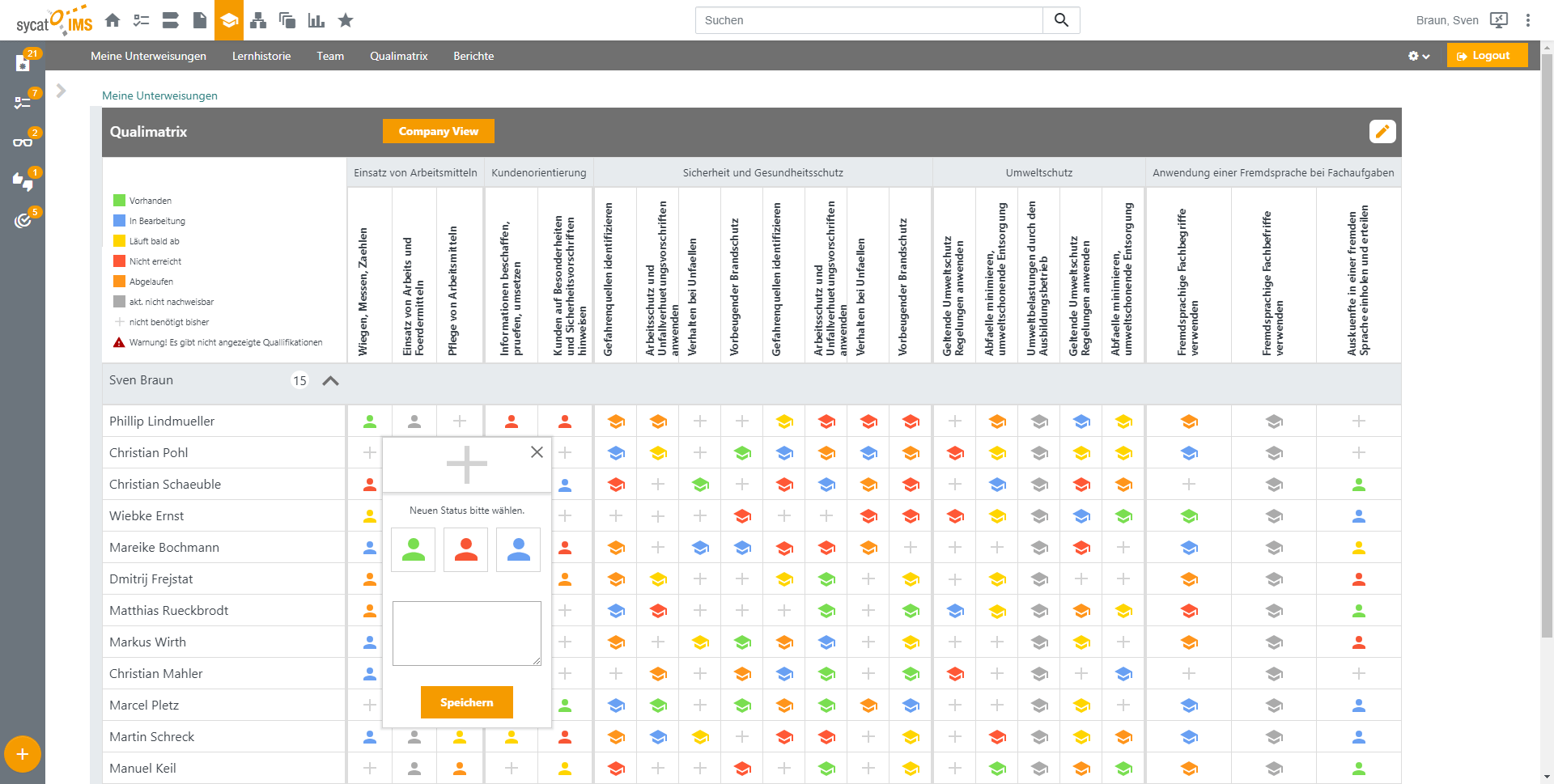 Erkennen Sie die Qualifikation Ihrer Mitarbeiter und steuern Sie sie gezielt mit elektronischen Schulungen, Unterweisungen und Weiterbildungsangeboten mit sycat eLU und der Qualifikationsmatrix. Erstellen Sie selbst Kurse im Handumdrehen oder buchen Sie Schulungen aus einem umfangreichen Katalog.